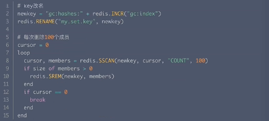 步骤:(1)key改名,相当于逻辑上删除key,任何Redis命令都访问不了该key。(2)小步多批次删除。