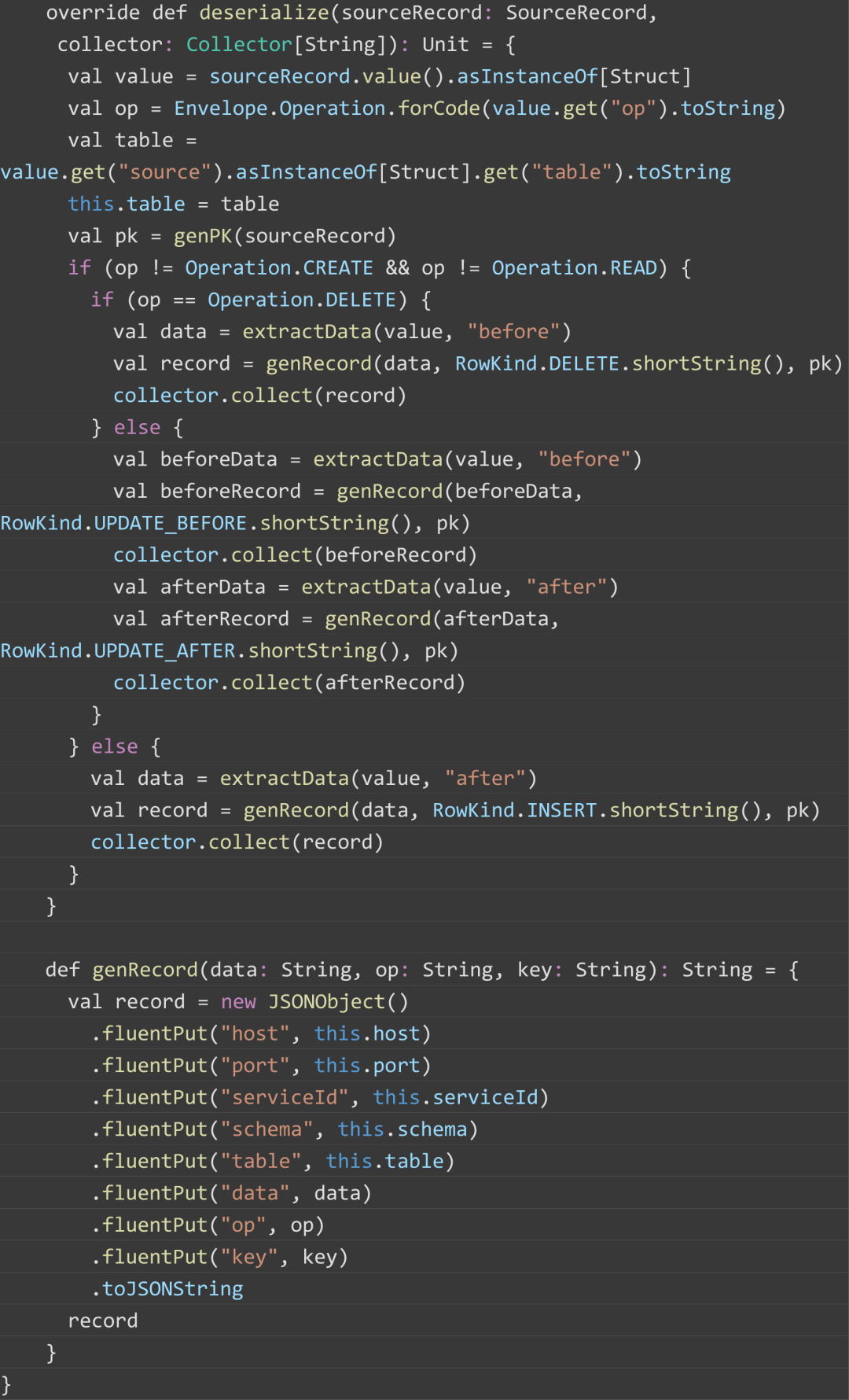 由于 Flink CDC 内部集成了 Debezium 组件,通过 Debezium 进行数据采集,所以数据格式同 Debezium,监听到的数据格式如下图所示,after 代表变化后的数据;source 代表源端的数据库相关信息,包括 Debezium 版本号、连接器类型、数据库名、表名等;op 代表操作的类型,此处为读操作。