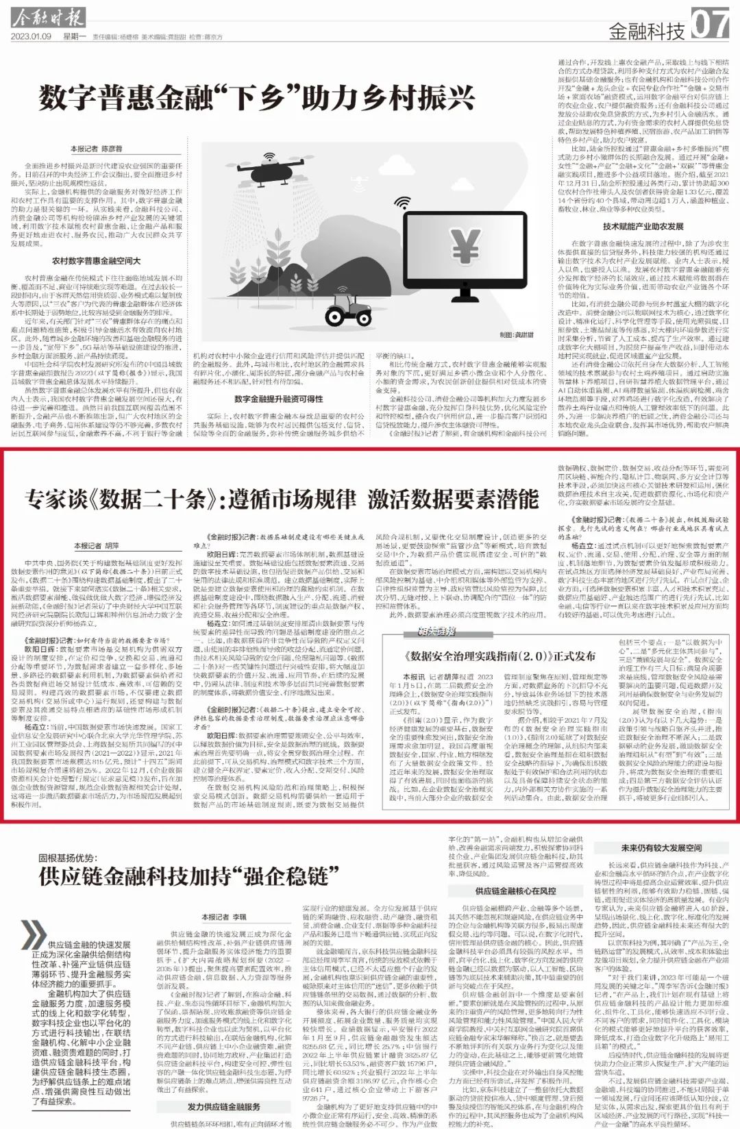 中共中央、国务院《关于构建数据基础制度更好发挥数据要素作用的意见》(以下简称《数据二十条》)日前正式发布。《数据二十条》围绕构建数据基础制度,提出了二十条重要举措。就接下来如何落实《数据二十条》相关要求,激活数据要素潜能、做强做优做大数字经济、增强经济发展新动能,《金融时报》记者采访了中央财经大学中国互联网经济研究院副院长欧阳日辉和神州信息新动力数字金融研究院资深分析师杨垚立。